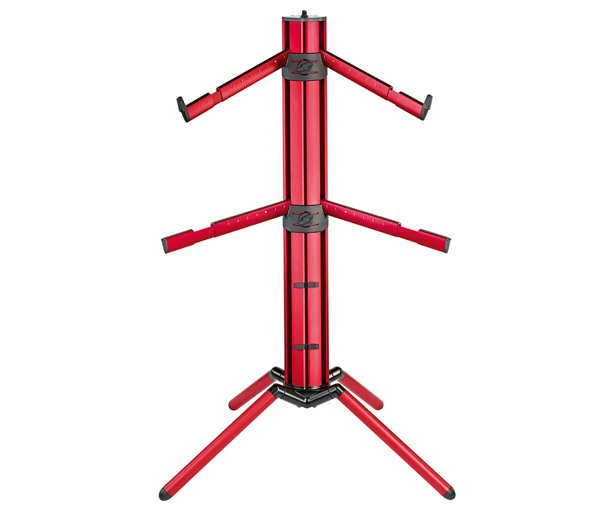 Er kann optional mit einem dritten Paar Auflagearme (Artikel 18865 oder 18866) für ein weiteres Keyboard aufgerüstet werden. Zusätzlich verfügt der Spider Pro am oberen Ende der Säule über einen 3/8″ bzw. 5/8″ Gewindeanschluss zum Anbringen eines Mikrofonarms. Eine verstärkte Schrägstellung der Säule ermöglicht ein bequemeres Spielen und bessere Sicht auf das untere Keyboard. Die klappbare Fußkonstruktion bietet viel Platz für Pedale und optimale Beinfreiheit.