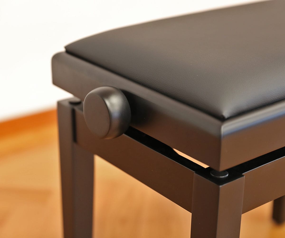 Diese Klavierbank ist mittels Spindel stufenlos höhenverstellbar – je nach Vorliebe der Sitzhöhe.