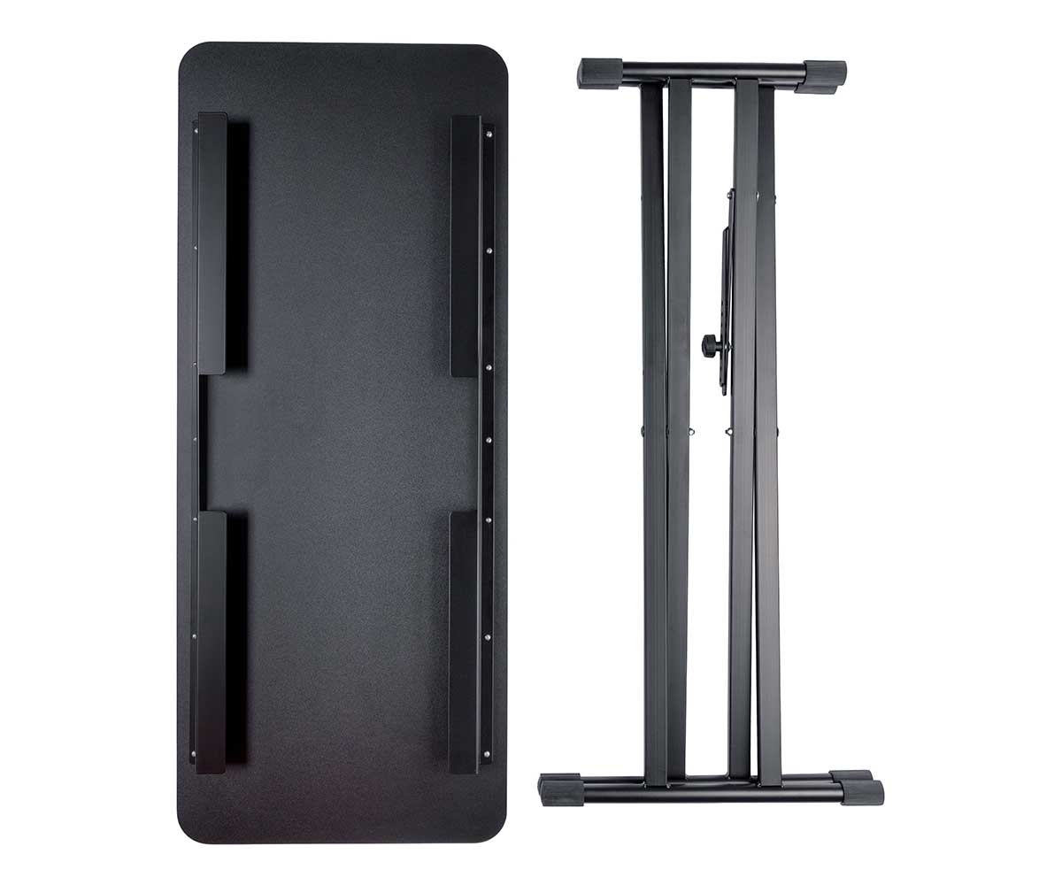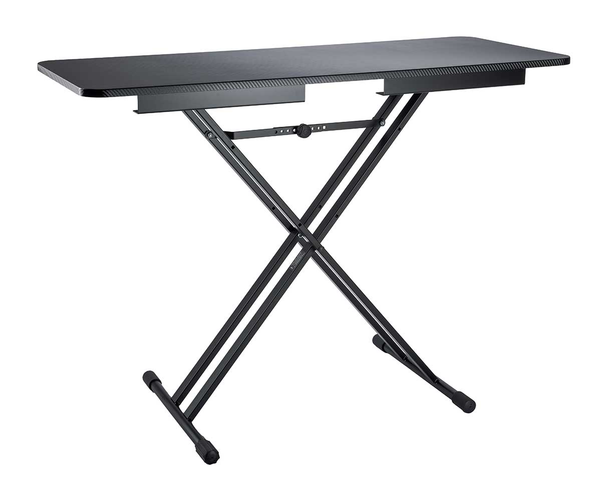 [vc_row][vc_column][vc_column_text]Das multivariable Set besteht aus dem weltweit bewährten Keyboardständer 18963 und der attraktiven Ablageplatte 18905 mit Carbon-Optik Beschichtung. Der doppelstrebige Keyboardständer mit integriertem Bodenausgleich sorgt für stabilen sicheren Stand. Die Ablageplatte mit dem Abmaßen 450 x 1.100 mm bietet genügend Platz für Controller, Mixer, Laptop, Synthesizer, etc. Der Aufbau ist im Handumdrehen erledigt. Hierzu wird die robuste MDF-Platte lediglich auf den Keyboardständer aufgeschoben und zentriert. Eine weitere Fixierung ist nicht erforderlich.[/vc_column_text][/vc_column][/vc_row][vc_row][vc_column][vc_column_text css=““]