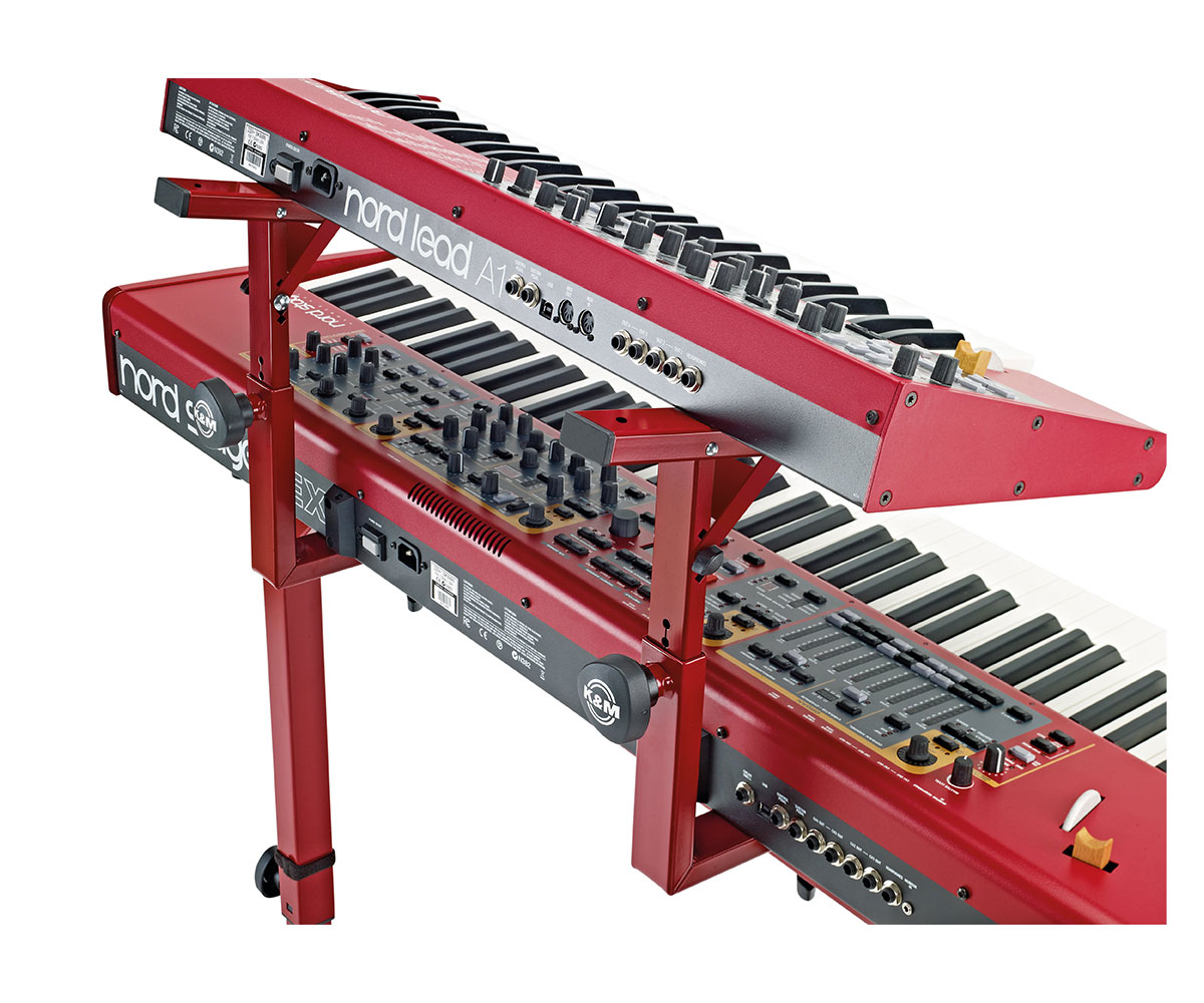 Die großen unteren Auflagearme können auch die größten Masterkeyboards aufnehmen. Die oberen Auflagearme können auch in der Tiefe in 4 Positionen verstellt werden, so dass das Blickfeld auf das untere Keyboard frei liegt. Der Aufsatz lässt sich einfach und schnell durch einen Rast- und Klemmknopf auf die gewünschte Höhe einstellen. Mit der Auswahl von 10 verschiedenen Höhen findet jeder seine persönlich beste Einstellung. Zur weiteren Optimierung der Spielposition können die oberen Auflagearme in 5 Stufen von 0° (waagerecht) bis 20° geneigt werden. Selbstklebende Auflagegummis verhindern ein Verkratzen oder Verrutschen der Instrumente.