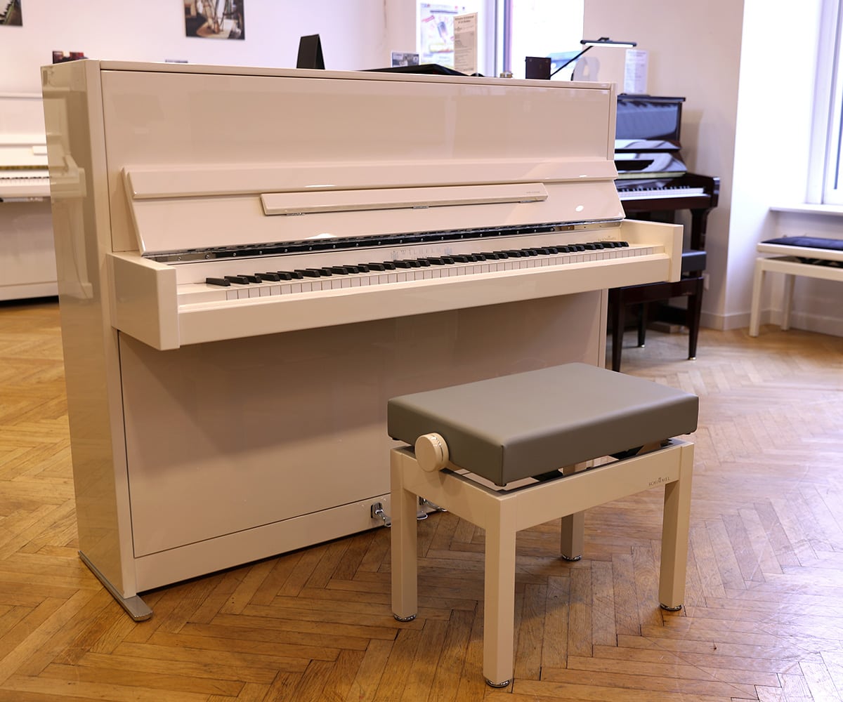 Die Qualität der Schimmel Instrumente basiert auf jahrhunderter langer Erfahrung und den neuesten Erkenntnissen der Piano-Manufaktur. Das Wilhelm Schimmel W114 verkörpert dabei das kleinste Modell der Wilhelm Serie mit einer Höhe von 116cm. Das Design steht dabei ebenfalls im Vordergrund und bietet einen tollen Blickfang, der jeden Tag neue Freude bringt. Es ist in der Ausführung Modern gestaltet. Die Beschläge und Pedale sind in Chrom glänzend ausgeführt. Das Instrument wird im polnischen Schimmel Werk technisch gleich gefertigt wie die Schimmel Konzert Klaviere in Braunschweig. Es handelt sich dabei um eine bewährte Konstruktion seit vielen Jahren.